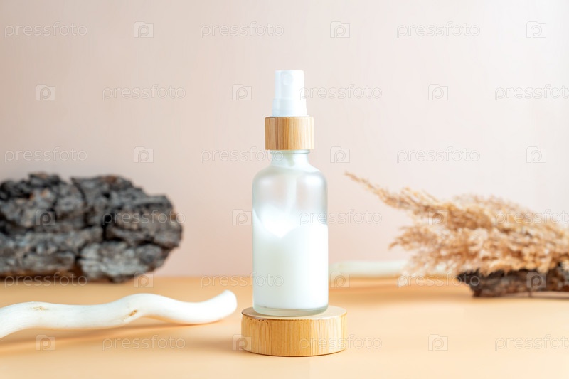 Бутылка косметического крема из белого матового стекла с древесной корой, деревянной ветвью
