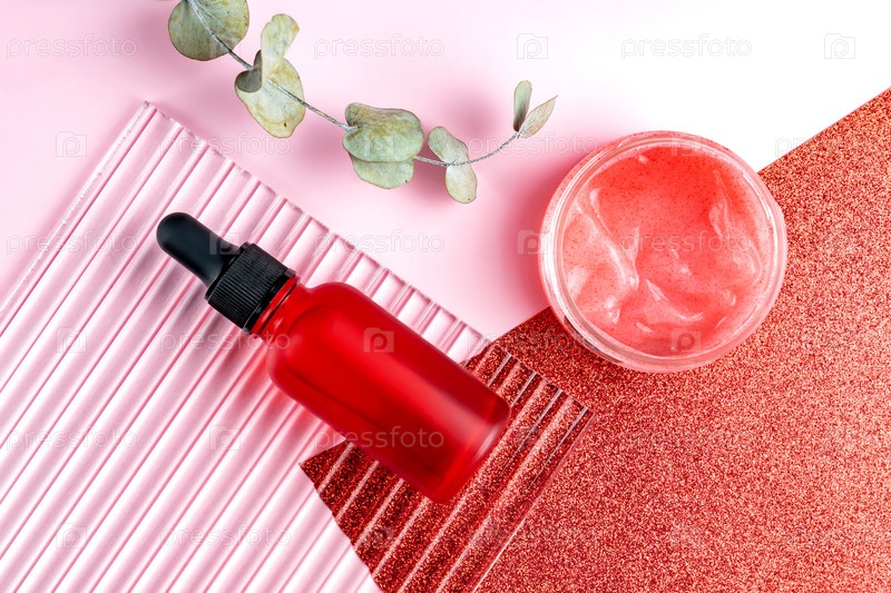 Косметический набор для отшелушивания кожи, вид сверху. Жидкая сыворотка-пилинг с энзимами и скрабом из фруктовых кислот с мелкими частицами в красной упаковке. Косметика по уходу за кожей в пустой упаковке. Макет