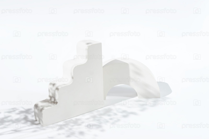 Белые бетонные рекламные стенды с цветочной тенью. Гипсовый подиум для презентации косметических продуктов на белом фоне