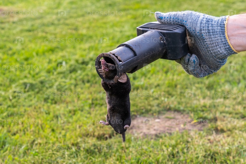 Крот в ловушке в руках садовника на фоне газона