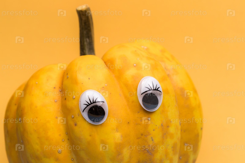 Забавная перезрелая тыква с глазами на оранжевом фоне, пространство для копирования