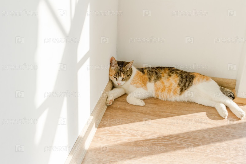 Полосатый трехцветный кот спит в углу на солнце