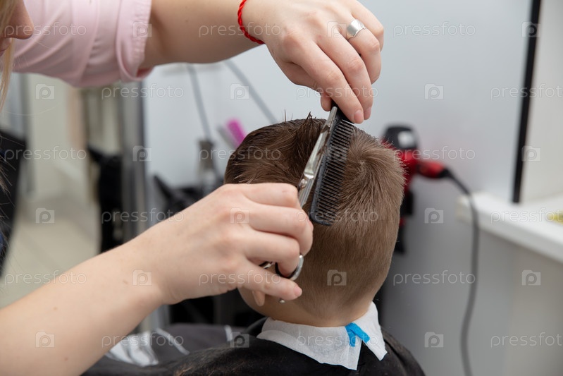 мальчик делает прическу в парикмахерской. Парикмахер делает прическу для мальчика
