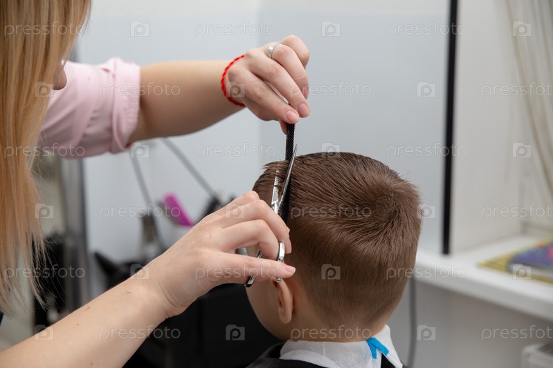 мальчик делает прическу в парикмахерской. Парикмахер делает прическу для мальчика