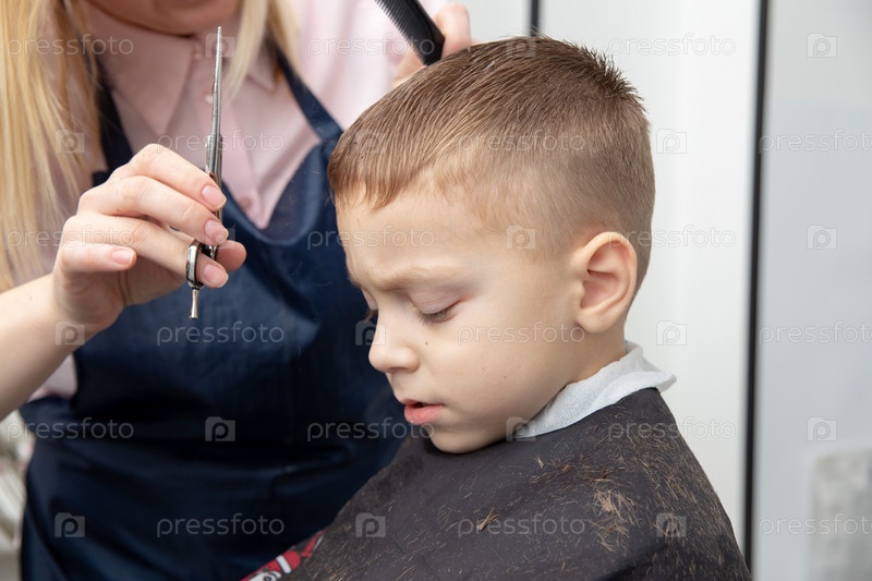 мальчик делает прическу в парикмахерской. Парикмахер делает прическу для мальчика