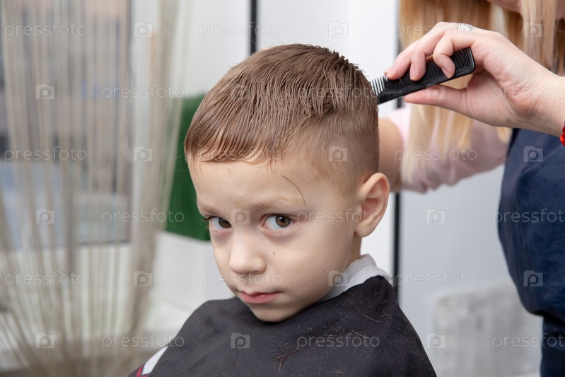 мальчик делает прическу в парикмахерской. Парикмахер делает прическу для мальчика