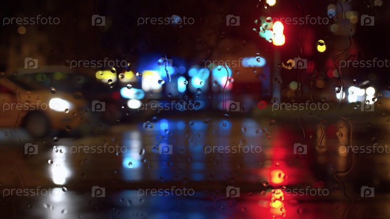 Капли дождевой воды на оконном стекле. Размытые светофоры ночного города. Фон города