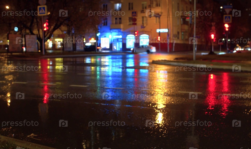 Размытые светофоры ночного города. Дождливый. Отражение разноцветных огней на мокром асфальте. Фон города