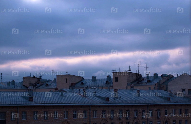 Темное облачное небо над городскими зданиями. Вечернее время, осень. Фон неба