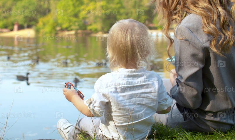 Молодая мать и ее малыш кормят уток на озере в парке. Они сидят на траве. Вид сзади
