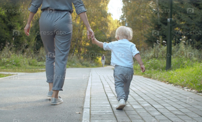 Малыш с мамой гуляют в парке. Мать держит за руку своего сына. Вид сзади. Семья, День матери