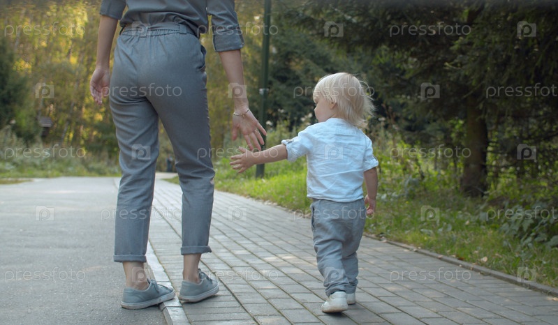 Малыш с мамой гуляют в парке. Мальчик дает руку своей матери. Вид сзади. Семья, День матери