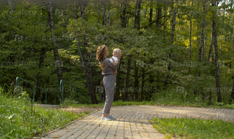 Мать держит на руках младенца. Мать и ее сын на прогулке в парке. Семья, День матери