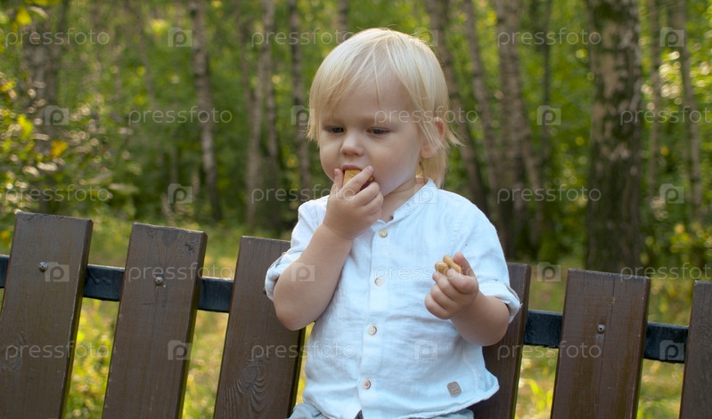 Крупный план портрета смешного малыша, стоящего на скамейке и поедающего печенье