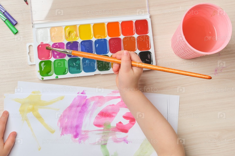 Маленький ребенок рисует акварелью на бумаге за столом