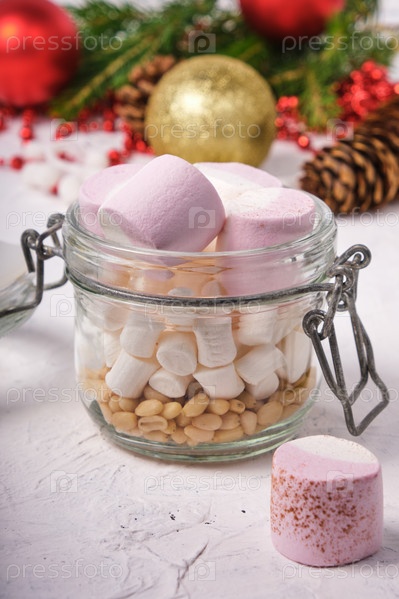 Кедровые орехи и зефир в банке на белой поверхности, сосновая шишка, еловые ветки, новогодние шары и украшения на заднем плане