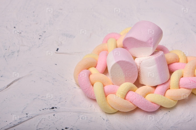 Несколько зефиров на белом фоне, длинные плетеные зефиры, зефиры с фруктовыми вкусами, пространство для копирования