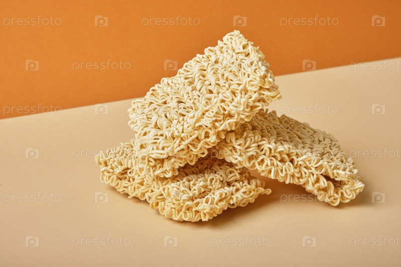 Три блока сухой лапши быстрого приготовления на коричневом и бежевом фоне