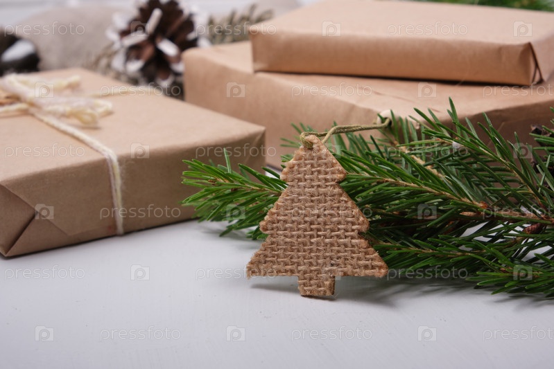 Деревянная еловая фигурка и свежая еловая ветка на фоне эко-подарков, эко-рождество и новый год, образ жизни без отходов