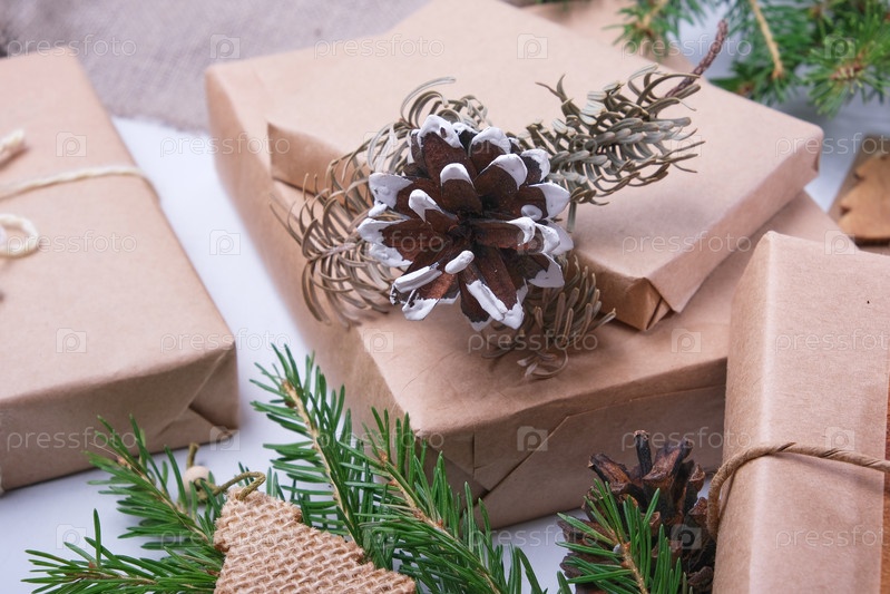 Сушеная еловая ветка и деревянная звезда с блестками на подарочной коробке, завернутой в эко-бумагу на сером фоне и льняной ткани вид сверху место для копирования экологически чистый образ жизни