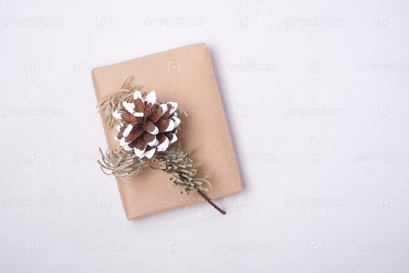 Сушеная еловая ветка и сосновая шишка на подарочной коробке, завернутой в эко-бумагу на сером фоне, вид сверху, место для копирования, экологически чистый образ жизни, эко-рождество и новый год