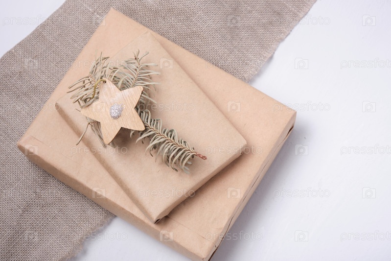 Сушеная еловая ветка и деревянная звезда с блестками на подарочной коробке, завернутой в эко-бумагу на сером фоне и льняной ткани вид сверху место для копирования экологически чистый образ жизни