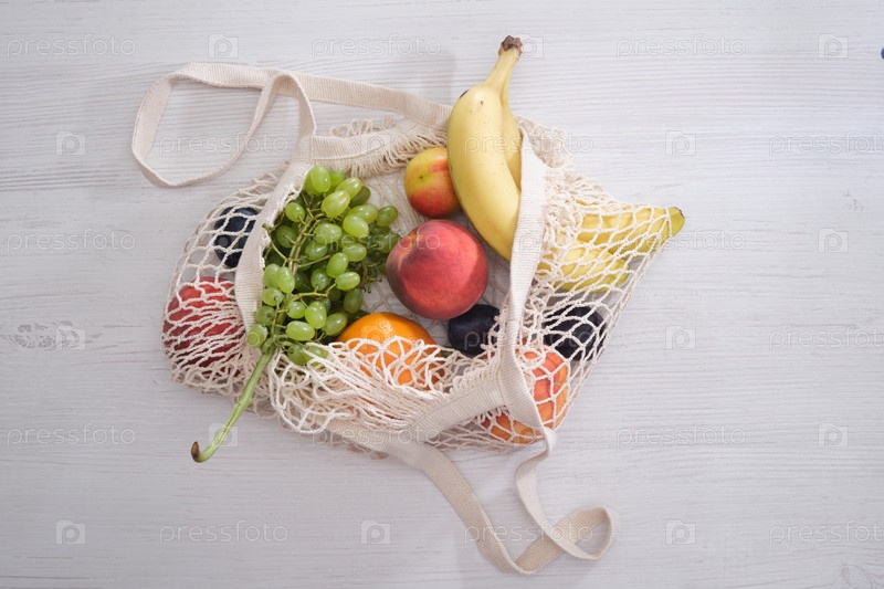 Фрукты и овощи в сетчатом мешке на деревянном фоне, копия пространства, вид сверху, экологически чистая концепция образа жизни, плетеная сумка для покупок без отходов