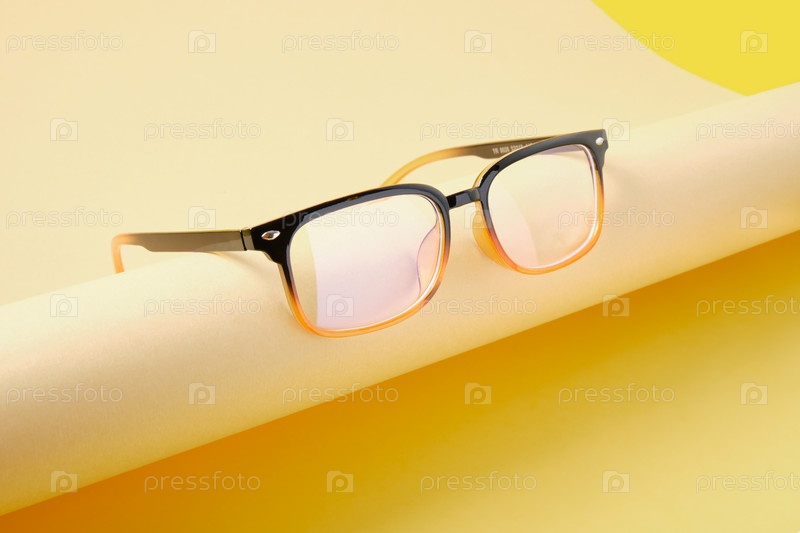 Очки на рулонной бежевой бумаге, геометрический фон, трендовые цвета, желтый фон