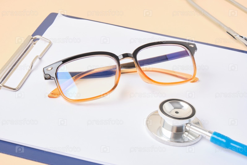 Очки и стетоскоп на бежевом фоне буфера обмена