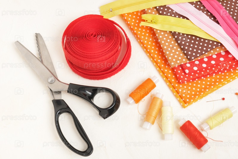 Катушки с нитками, ткани, застежка-молния и липучка на столе, аксессуары для концепции шитья