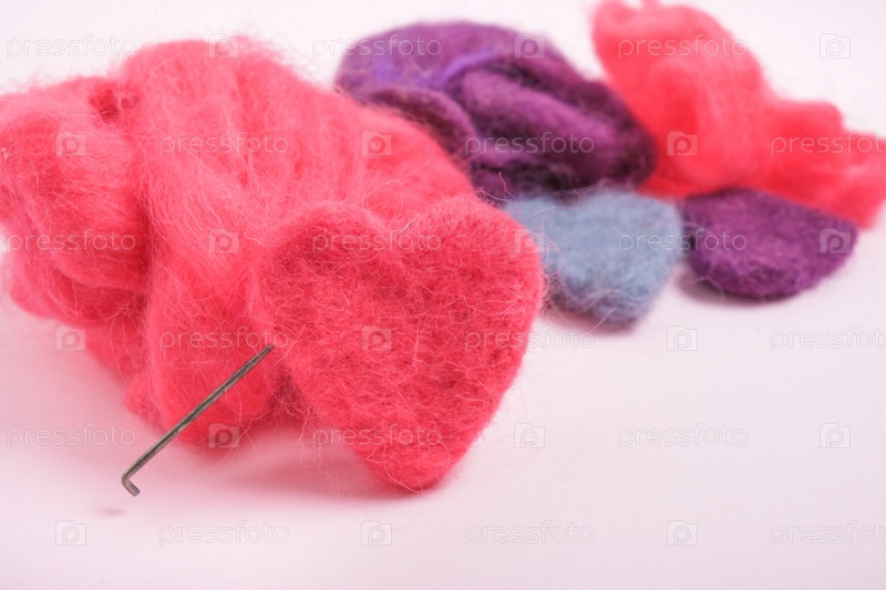 Несколько разноцветных валяных шерстяных сердечек на розовом фоне
