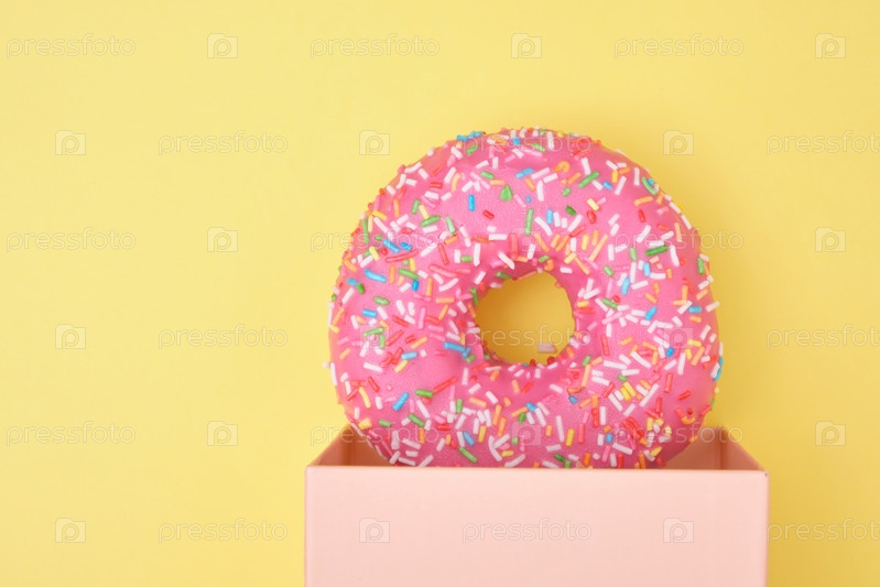 Пончик с посыпкой и розовой глазурью в подарочной коробке на желтом фоне