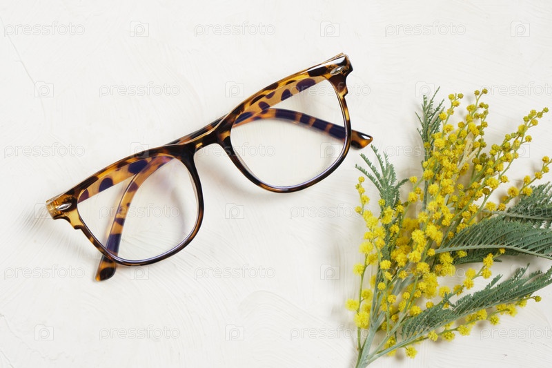 Модные современные очки и ветка мимозы на бежевом светлом фоне копируют пространство, концепцию летнего и весеннего настроения