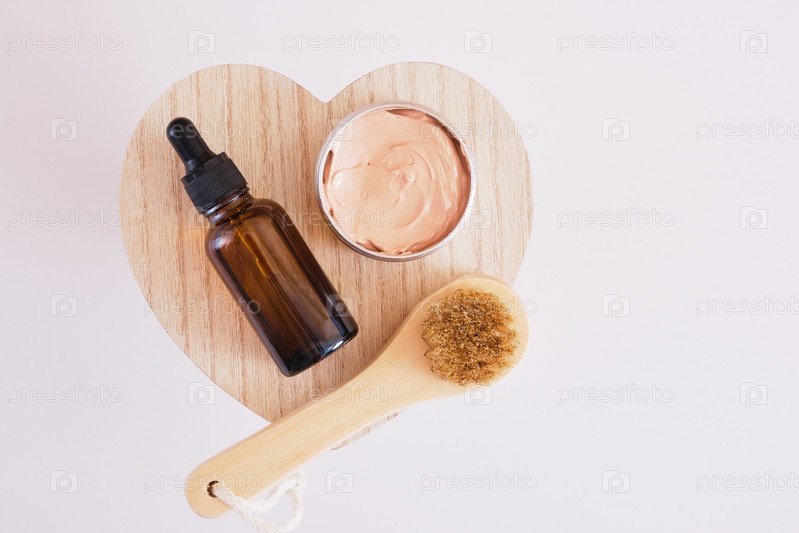 Янтарная стеклянная бутылка с пипеткой, баночка косметической глины и деревянная щетка для массажа лица на деревянной подставке в форме сердца, серый фон, концепция ухода за кожей
