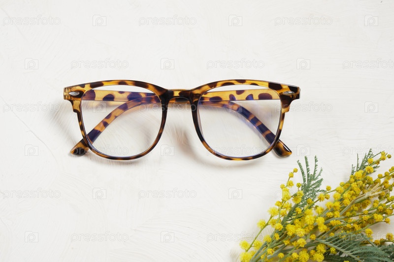 Модные современные очки и ветка мимозы на бежевом светлом фоне копируют пространство, концепцию летнего и весеннего настроения