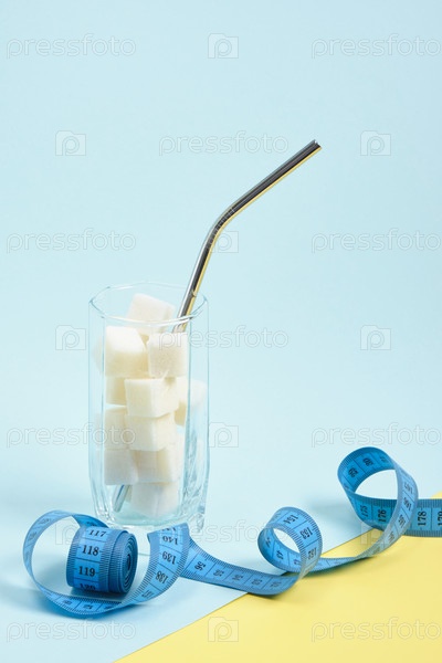 Измерительная лента и стакан с кубиками сахара и коктейльной трубкой светло-голубой и желтый фон копией пространства