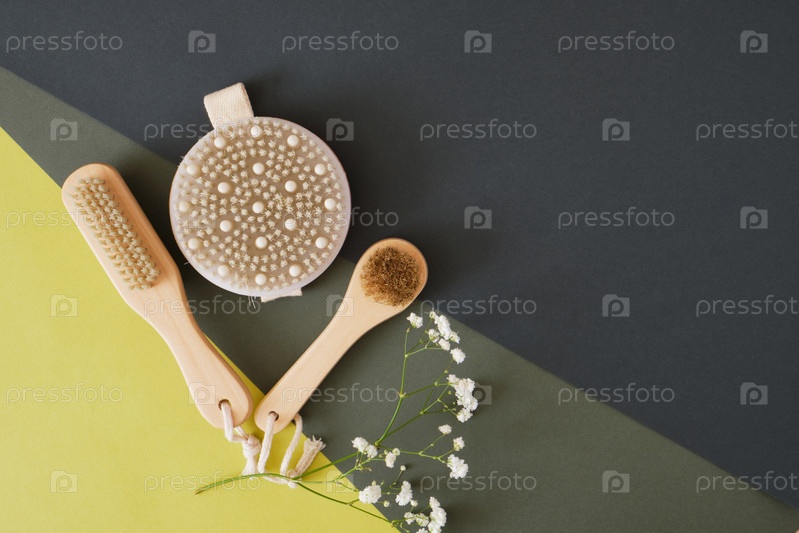 Деревянная антицеллюлитная щетка с натуральной щетиной для сухого массажа тела и лица зеленый геометрический фон. Лимфодренажный и отшелушивающий массаж. экологически чистый и безотходный образ жизни