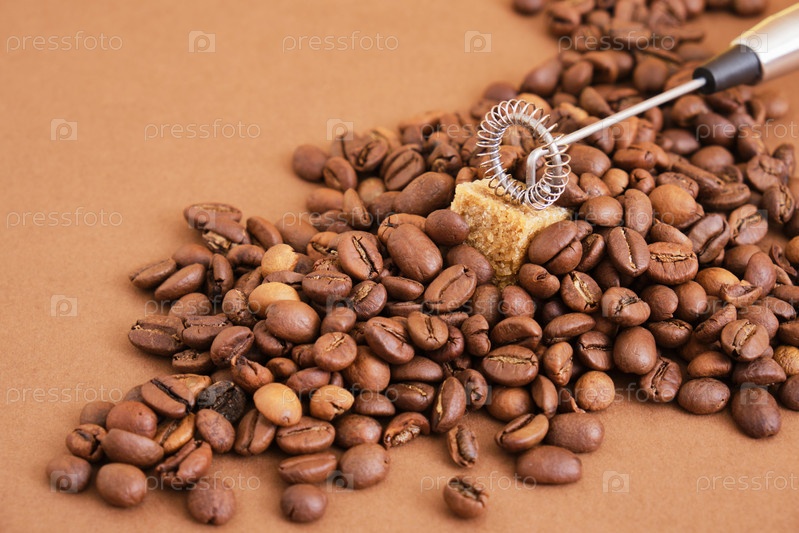 Куча кофейных зерен, кубик сахара и металлический ручной пароход для молока на коричневом фоне. Ручной пенообразователь