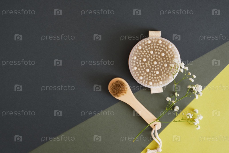 Деревянная антицеллюлитная щетка с натуральной щетиной для сухого массажа тела и лица зеленый геометрический фон