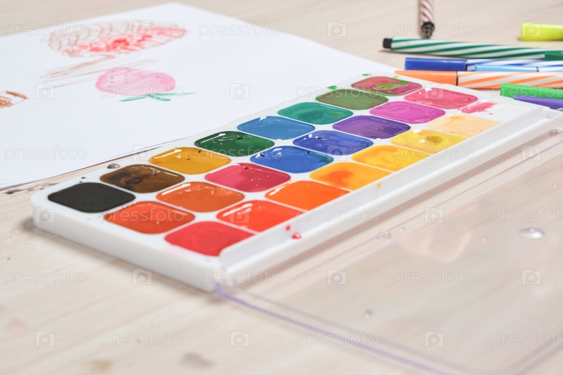 Акварельные краски и рисунок маленького ребенка на деревянном светлом столе