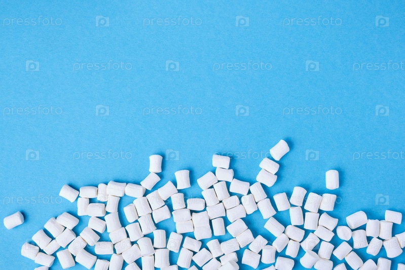 Маленькие белые зефирки, разбросанные по синему фону, копируют пространство