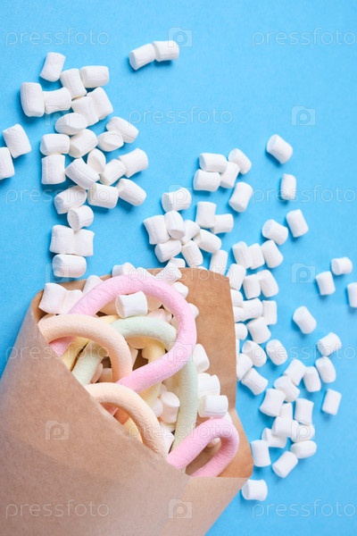 Различные виды зефира, завернутые в бумагу на синем фоне