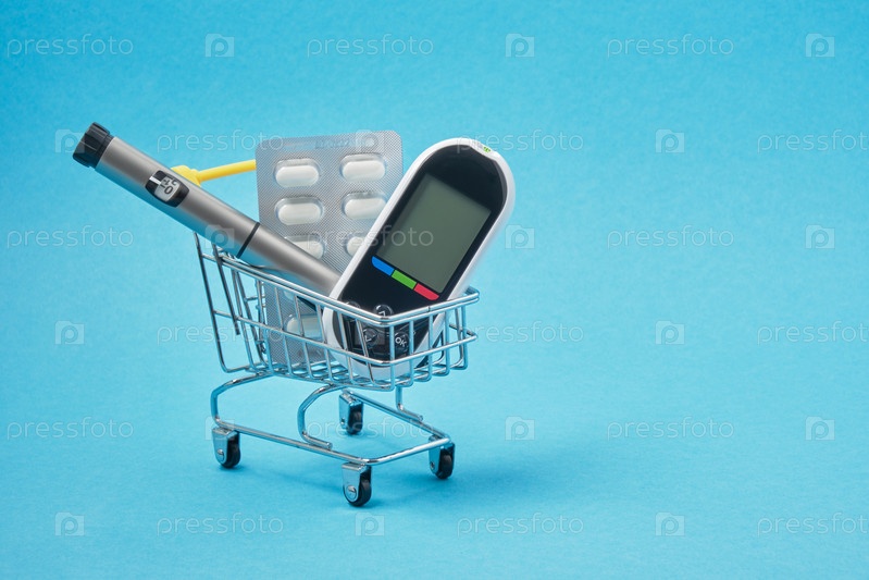 Концепция диабета. Диабетические принадлежности в магазинной тележке на синем фоне