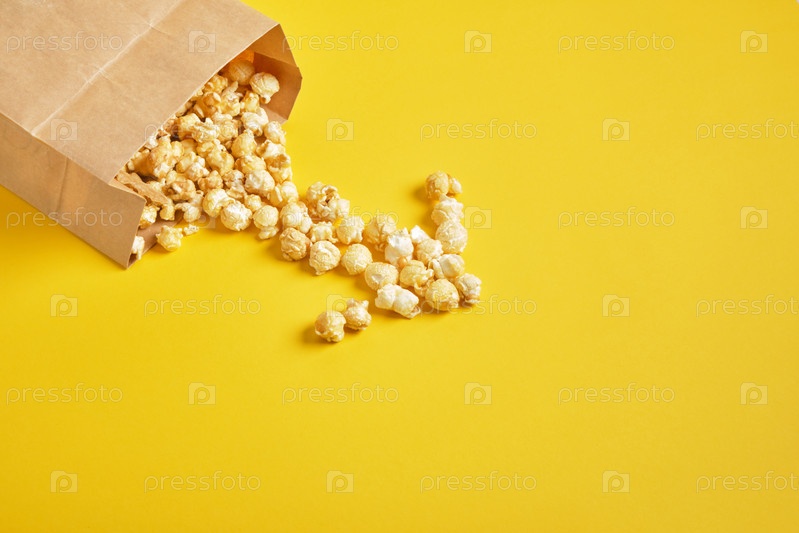 Карамельный попкорн в бумажном пакете на желтом фоне. пространство для копирования