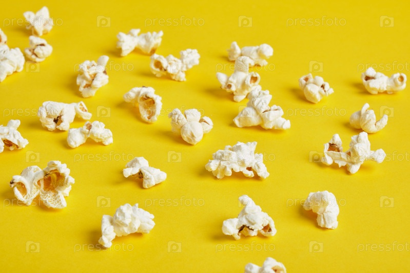 Попкорн на желтом фоне. Шаблон попкорна. вид сверху, пространство для копирования