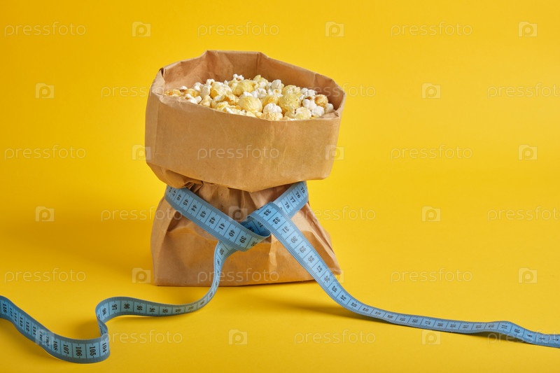 Карамельный попкорн в бумажном пакете с мерной лентой на желтом фоне