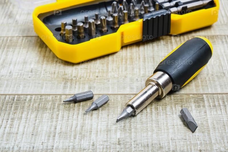Отвертка с насадками на деревянном фоне