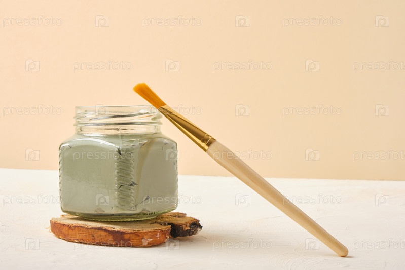 Стеклянная баночка с косметической глиной и кисточкой для нанесения