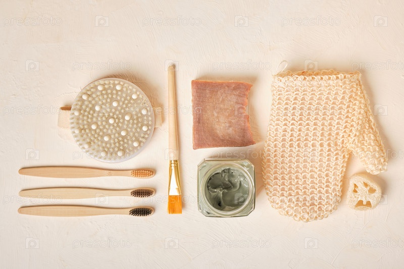 Люфа, мыло, голубая глина в стеклянной банке, щетка, мочалка и бамбуковые зубные щетки