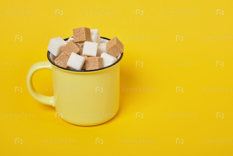 Кубики тростникового коричневого и белого сахара в желтой чашке на желтом фоне
